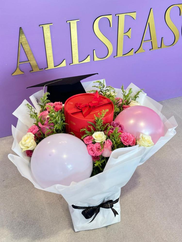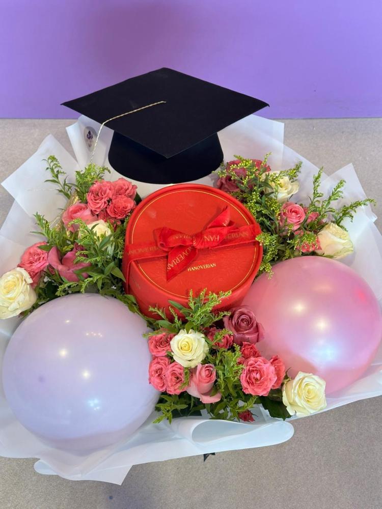 اجعل لحظة التخرج لا تُنسى مع باقه تخرج فاخرة مصممة بطريقة حصرية، تضم شوكولاتة هنوفيرين مكس براند مع قبعة تخرج ومزيج من الورود الطبيعية والبالونات لتضفي على احتفالك لمسة راقية.