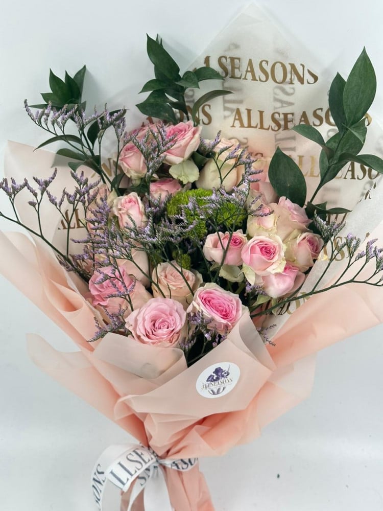 تحتوي باقة ورد حنين على 3 أغصان من البيبي روز الطبيعي و أغصان الروز الطبيعيه و شجيرات الليمونيوم