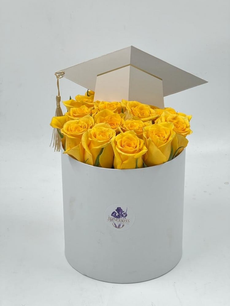 يحتوي على 10 -15 من أغصان من الروز الاصفر الطبيعي مع تغريسة شكل قبعة تخرج
